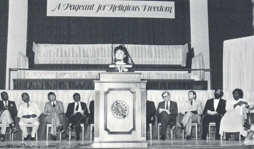And then, even in the midst of my shortcomings and my inadequacies, Father and Mother have bestowed upon me the greatest blessing, that is, representing the True Family, representing my brothers and sisters at the Constitutional Hall Pageant for Religious Freedom. When I heard Father had chosen me to speak I was stunned and I didn’t know why such great blessing had come to me, to such an unworthy me. I was not sure if I could live up to Father’s expectations. I was not sure if I could do my responsibility as his daughter in front of 4000 ministers. So that day, for the first time, I went on a cold shower condition. I was terrified, to tell the truth. I mean everything that came to mind I did. I prayed, I fasted, Lord knows what else I did, and I don’t know how I went through that night as I did. And I don’t know how I stood there without my knees falling apart below me and was able to give Father’s message to all those ministers. I believe it was not I who was speaking, I believe it was Father who was speaking through me, because even as I was reading Father’s letter, I felt so much of Father’s heart in it. I almost had to hold myself back from just crying out and bursting into tears and shouting: