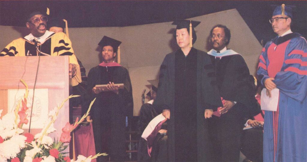 On behalf of my husband, the Reverend Sun Myung Moon, and our family, I would like to express my deep gratitude for the honor you have bestowed upon him this day. My husband was especially moved when he read of the history of Shaw University and Shaw Divinity School, and of their founder, Dr. Henry Martin Tupper, for he found in the life of your founder two Christ-like characteristics to which he dedicated his own life: love of God and service to humanity.