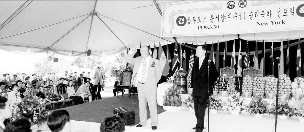[While Peter Kim translated Father tossed a number of bananas out into the audience.] Those who received bananas raise your hands. Seven. This is a sign of blessing. The banana tree bears fruit throughout four seasons. Seven is the number of completion, or perfection. Do you therefore want to bring 7 young people to the blessing, or 70, or 700? It has to be at least the perfection stage. If 7 is the formation stage, 70 is growth stage and 700 perfection stage, or even greater would be to want to bring 7,000 people. We could have the confidence to bring even 7,000 countries. But of course there are not that many countries in this world. So just 7,000 people is no problem. What is your choice, do you want to bring 700 or 7,000 young people back to God? [7,000!] With all your senses open and united, joined with God as one you can do anything, can’t you?[Yes!] I am grateful that you have given such a beautiful answer, sitting here in this hot sun, sweating, without having had anything to eat yet.