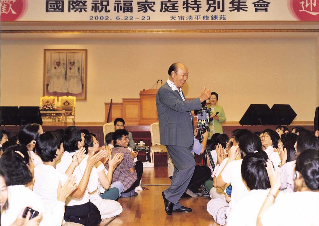 Before Father spoke, he and Mother walked back and forth the length of the hall, stopping here and there to speak to members. Father devoted a portion of the time he spoke to explaining the mission of those blessed with Koreans. This content is taken from the on-site interpretation, with additional translation and editing.
