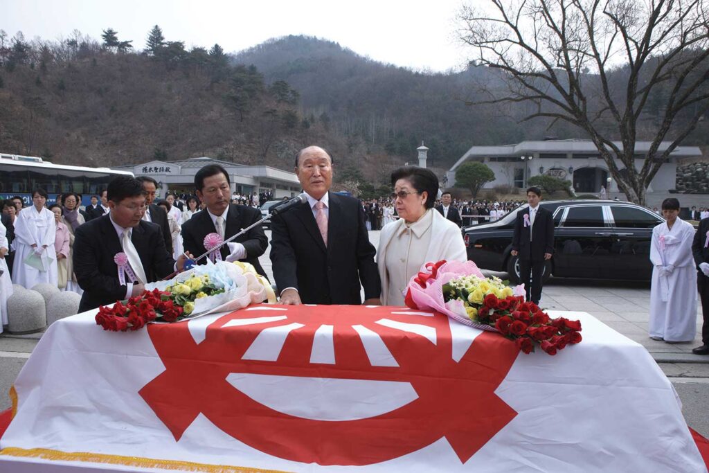 We cannot but entrust him with this difficult work of expanding the boundaries enclosing the sorrows and grief of the True Parents and that of opening the way to the deep valley of heart blocking the way in the realm of God’s heart in the spirit world with autonomous authority, for he could not become Shim Cheon Gae Bang Won Choong Hyo Gae Moon Joo if such a responsibility were not entrusted to him. Therefore, we seal such an important mission upon him in the name of True Parents and dedicate him before You and send him to the spirit world.