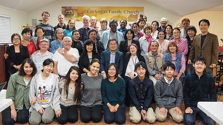 Las Vegas Family Church:  Friday, November 7th, church pastor, Reverend Ken Doo hosted a church community meeting in Cheong Hwa Gung’s church sanctuary. This meeting was held in order to discuss and share some methods that could be used to strengthen and inspire the growth of the church community. The meeting began with a prayer and a light dinner of chicken, rice, kimchi and salad. Whilst everyone was enjoying the food, the seven newly arrived missionaries (4 girls and 3 boys) sang two beautiful songs that they had prepared. The first song was a classic “Lean On Me” with a cuter Japanese youthful twist to it and the second was a humble Japanese favorite called “故郷/Hometown”. After the singing and most of the eating, Bishop Kim Ki Hoon  was asked to share a few words of wisdom with the gathered congregation. Bishop Kim Ki Hoon gave a detailed speech about True Mother’s instruction on Tribal Messiahship and its relevance within the Unification Community.