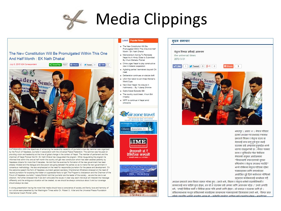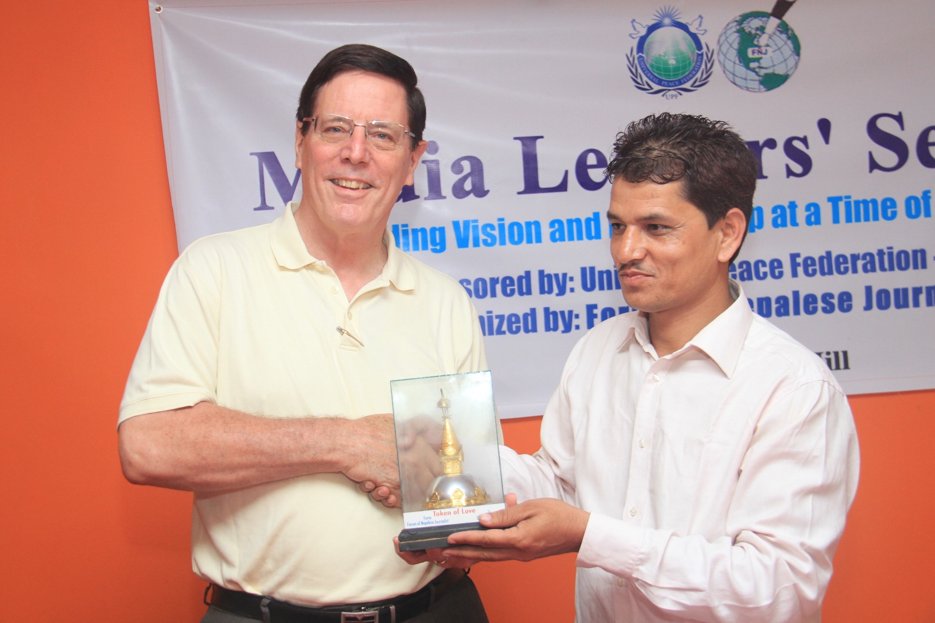 The theme was, “Providing Vision and Leadership at a Time of Global Change.” It was organized by the Forum of Nepalese Journalists (FNJ), a coalition of nearly 400 professional media persons working throughout Nepal. The Universal Peace Federation-Nepal helped to co‑sponsor the event.