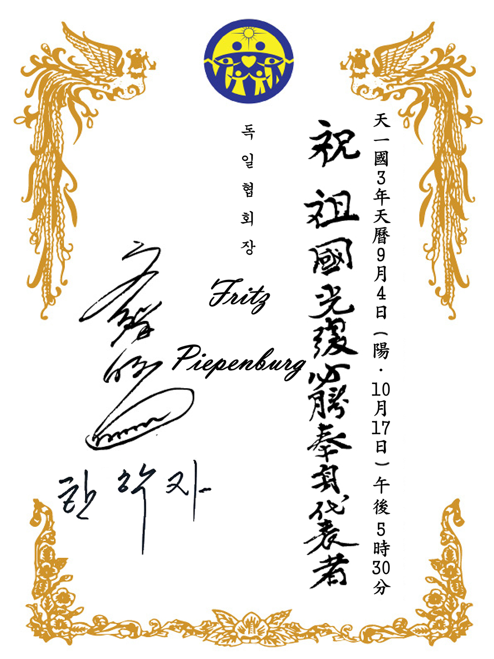 True Mother’s calligraphy for Fritz Piepenburg