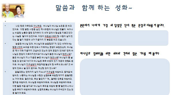 - 現場のどこからでも信仰を普遍教育に活用可能であり、部署別に原理、聖書、真の父母様の生涯路程、八大名節、三大祝福と徳目に区分して、体系的に礼拝のみ言を準備できるよう構成された礼拝案のコンテンツ