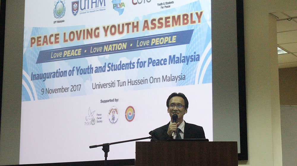 On November 9, 2017, the “Peace Loving Youth Assembly (PLYA) 2017” took place in University Tun Hussien Onn (UTHM), Johor Bahru, Malaysia. The UTHM Vice Chancellor attended the event & receives Ambassador for Peace award from the organizer of UPF. UPF Malaysia also gave away the Youth Ambassador Award to 3 model students.