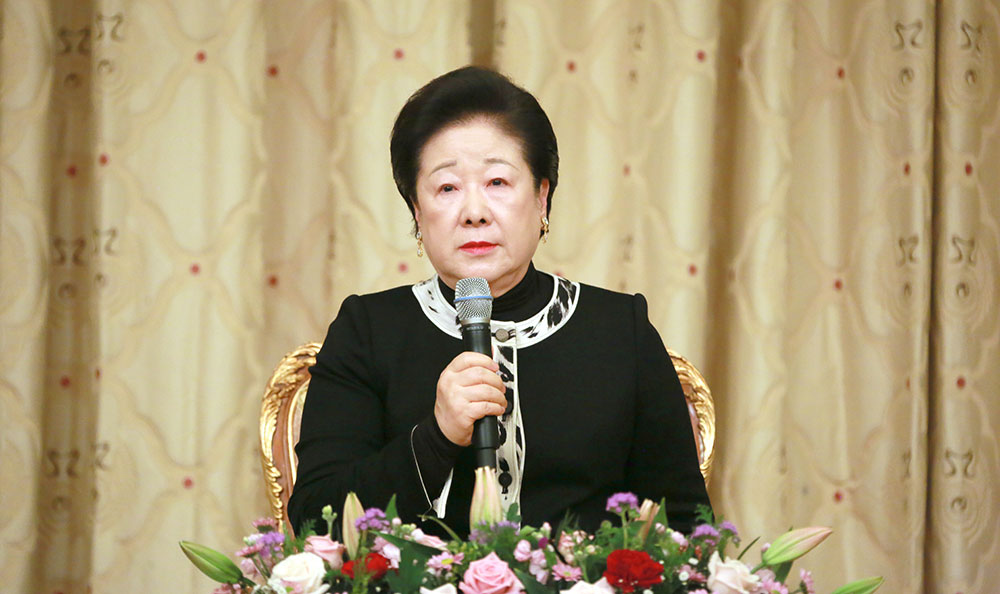 After a short break, True Mother entered the hall and spoke for almost 40 minutes. In her speech, Mother mentioned the Japanese church’s dedicated effort that resulted in two successful rallies, bringing ten thousand people together, both in regions where the church membership was a much lower number. She wanted to know whether leaders in Korea were also confident to also hold such rallies. Mother expressed that God had discovered and chosen the Korean race, and that the Korean people have gone through serious trials. “Heaven blessed this nation,” she said. “True Parents were born here and through the new lineage many blessed families were created.” Even so, she continued, despite the efforts of many who went out, including national messiahs, we have not yet been able to establish the heavenly environment.