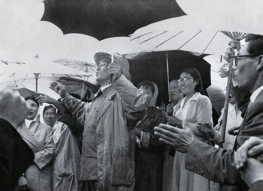 True Father holds an outdoor service with members in late June, 1960 (which in Korea is the rainy season).