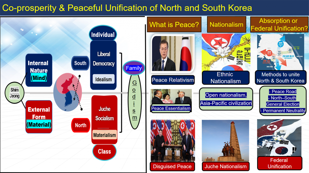 Important for our talk is the ideals of coexistence, co-prosperity, and co-righteousness. In our life here on the Korean peninsula, how can we achieve the vaunted yet challenging goal of unification? Taking these ideals of coexistence and co-prosperity, we have the contest of socialism vs. liberal democracy as opposing rivals. The thing that can unite them is co-righteousness. We must identify our universally shared values.