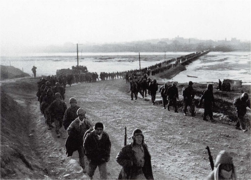 UN Forces cross the Taedong River on December 4, 1950, during their evacuation of Pyongyang, which they had held for forty-five days; They had crossed north of the Thirty-Eighth Parallel in early October, but were driven back south of the Thirty-Eighth Parallel after China entered the Korean War.