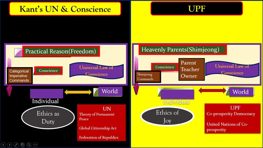 Let’s look at Kant’s conscience and the basic position of the United Nations and UPF. To put it simply, Kant’s conscience, moral laws, categorical orders, and sources of conscience were viewed as practical reasons. The order of reason, which is the source and order of conscience, is a moral and definite order. It’s an order that allows our own individual actions to be universally valid laws. It’s asking you to act the same way when you’re alone or when you’re with multiple people. It is a categorical order to ask you to act with your heart in confidence. That’s a moral imperative. The source of the order is reason. The reason is to choose freedom. Kant’s order is the ethics of duty under these moral laws. Kant’s theory of permanent peace is applied to the basic political scene of the United Nations, world peace, and permanent peace. The United Nations must go through that form of republication, not despotic monarchs, where the universal principle of conscience applies to the world. It’s the union of republics that is governed by universal moral laws called world peace, world civil law, public law. This is the League of Nations by Kant, now the United Nations.