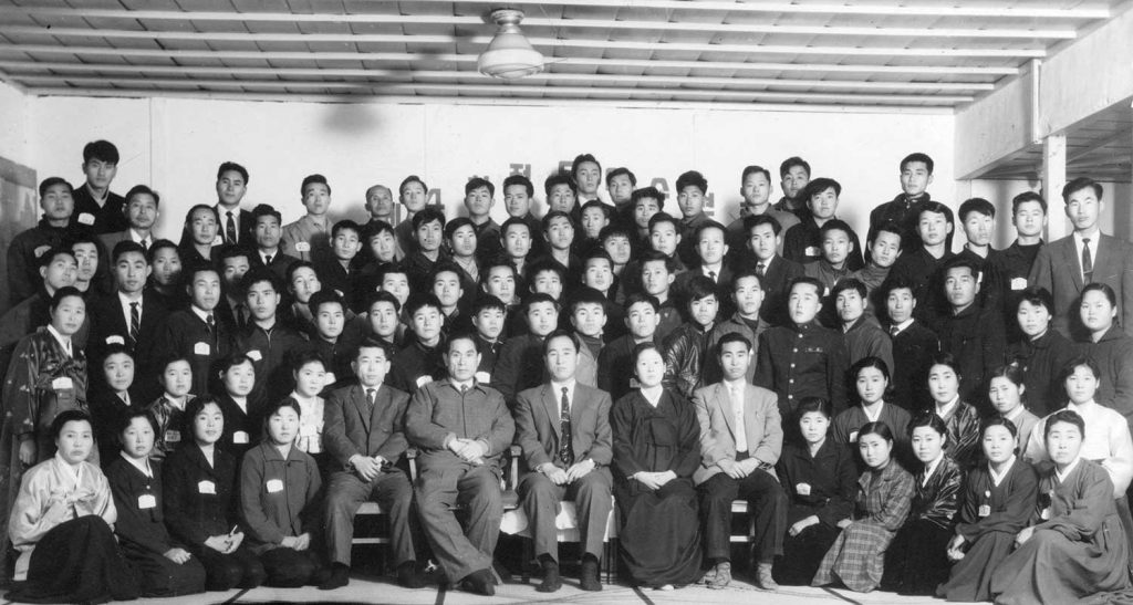 On chairs, left to right: Su-won Chung, Hyo-won Eu, True Father, True Mother and Chang-seong Ahn at the fourth graduation ceremony of a workshop for witnessing leaders on December 20, 1960; five more such forty-day workshops were held in 1961.
