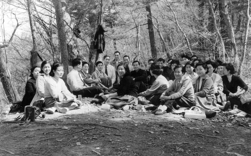 True Father, leaning against a tree, with members at an outdoor service in 1961. Occasional outdoor services are still a Korean church tradition.