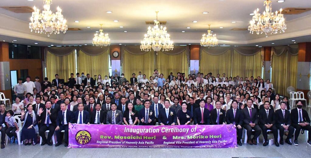 The Inauguration Ceremony of President Masaichi Hori and Mrs. Moriko Hori as the Regional President and Regional Vice President, respectively, of Heavenly Asia Pacific took place on June 18, 2023, in Bangkok, Thailand. The event brought together approximately 250 members in person and 500 participants virtually, symbolizing the unity of the community. The program included vibrant songs, greetings from leaders, a video introduction of President Horis’ journey, and speeches emphasizing the importance of unity, education, and the establishment of Heavenly Unified Korea. The ceremony concluded with a cake-cutting ceremony, congratulatory messages from international leaders, and a captivating performance by the Asian Top Gun Graduates.