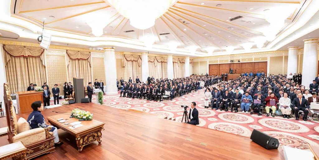 On 2.19 by the Heavenly Calendar in the 13th year of Cheon Il Guk (March 18, 2025), the “Ceremony to Bestow the Cheon Il Guk Meritorious Service Award and Special Holy Item, Officiated by the True Parents of Heaven, Earth and Humankind” was held in the 2nd floor chapel of Cheon Jeong Gung. About 600 people attended, including long-serving active members from Heavenly Korea and Heavenly Japan, young public leaders, and members of our younger generation from the Universal Peace Academy (UPA) and the Cheon Il Guk Leadership Academy (CLA). We are sharing True Mother’s message from this day with Family Federation churches and providential organizations worldwide.