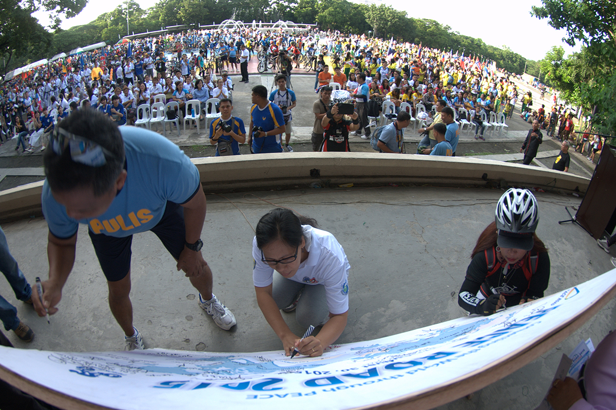 Then the signing of the Peace Road banner by representative leaders and participants followed. After the ringing of the “World Peace Bell”, the peace bike tour commenced. All were in high spirits and fully animated as the excitement of seeing a variety of bikers started to make their way out of the venue and onto the 21-kilometer bike loop around Quezon City.