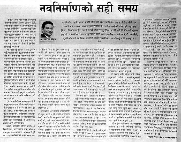 FFWPU Nepal: True Father’s heart and teachings are being heard at the national level in Nepal. Rev. Santosh Paudel is featured on the editorial page of a major daily broadsheet newspaper. He is the President of FFWPU-Nepal and the Vice-Chairman of UPF-Nepal.