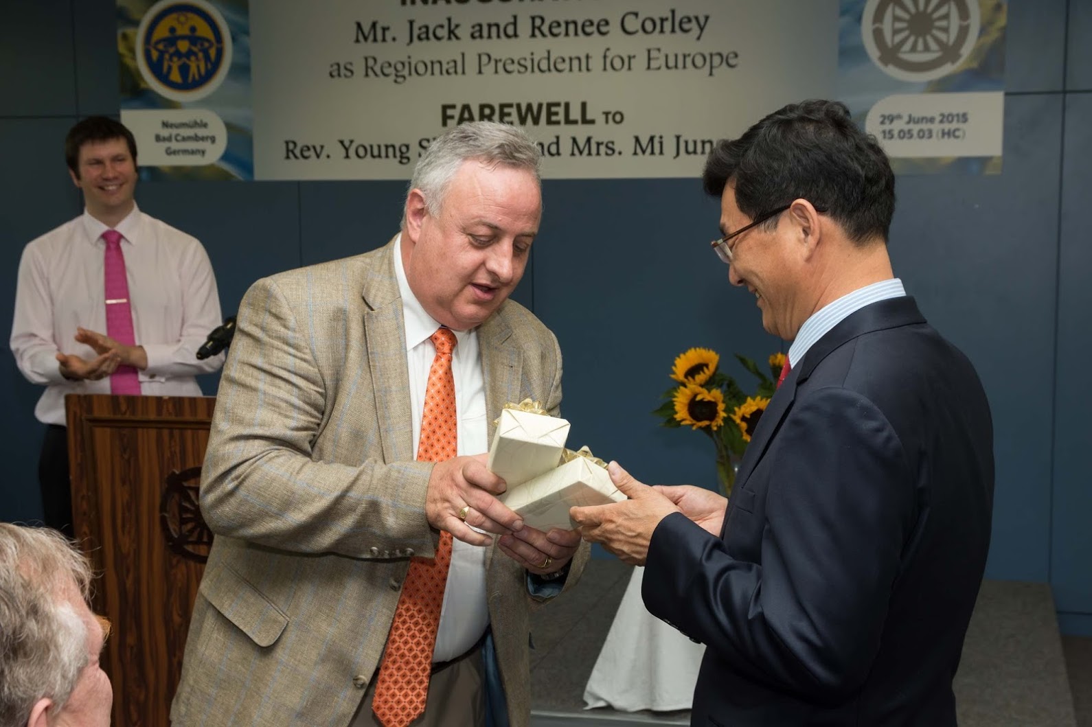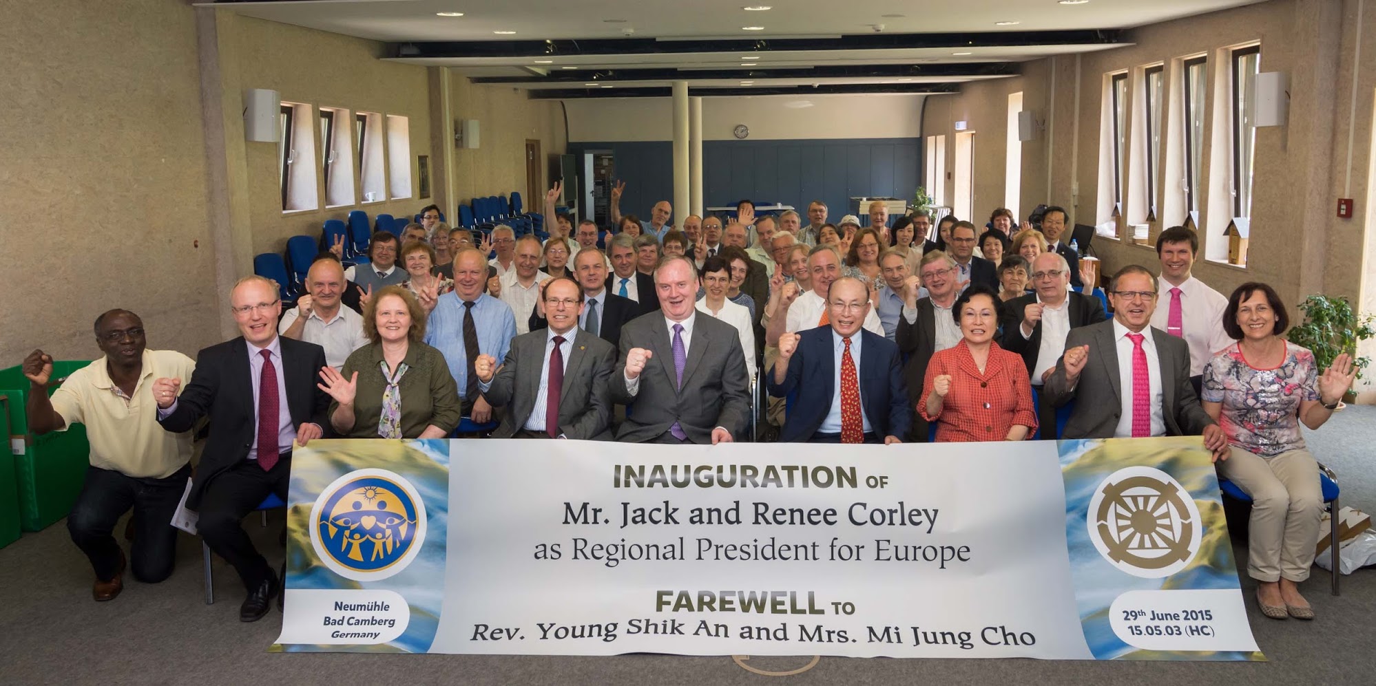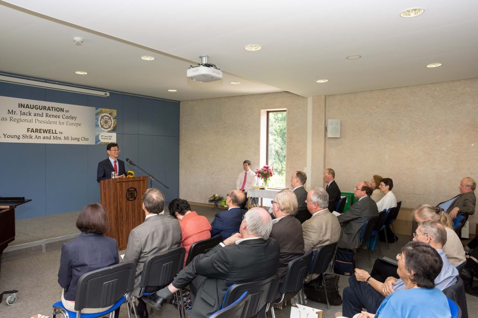 FFWPU Europe, By Fritz Piepenburg, Neumühle, Bad Camberg, June 29, 2015:  Church leaders from all over Europe together with members of the Frankfurt, Giessen and Dusseldorf community participated the farewell ceremony for our continental director Rev. Young Sik An, followed by the welcoming of the new continental director of Europe Rev. Jack Corely. The event took place on Monday, June 29th at the Seminar House Neumuehle.