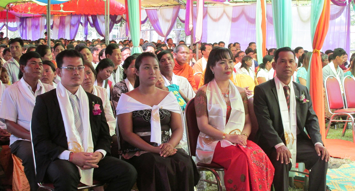 Main program started with singing for national anthem after arriving of the main guest, Mrs. Dy Samet, chief of Samlout district, Mrs. Nhet Sarim, chief of district council of Samlout district, Mr. Yem Yorn, Chief of Meanchay commune and Mr. Shu Lin, Director of UPF-Malaysia, Penang branch. 3 Blessed Families came from Battambang town, which away from 80 kilometers from Samlout district voluntarily came to be as attendance. 438 couples, 865 people including 10 Christian couples, 4 Khmer Muslim couples and 2 Monk came to attend this Interfaith Peace Blessing Ceremony.