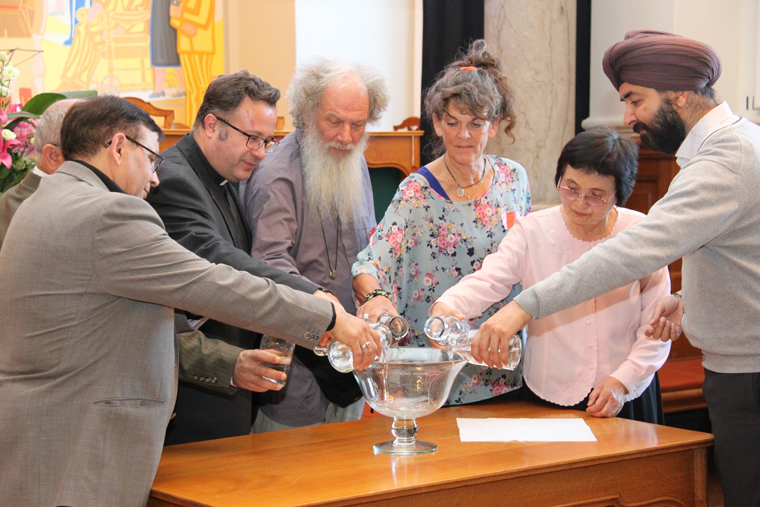 Thorkil Christensen introduced and gave a moving explanation of the deep symbolic meaning of the peace ceremony before seven religious leaders representing Judaism, Protestantism, Catholicism, Islam, Buddhism, Hinduism and Sikhism poured water in a common bowl in a serene and solemn atmosphere.