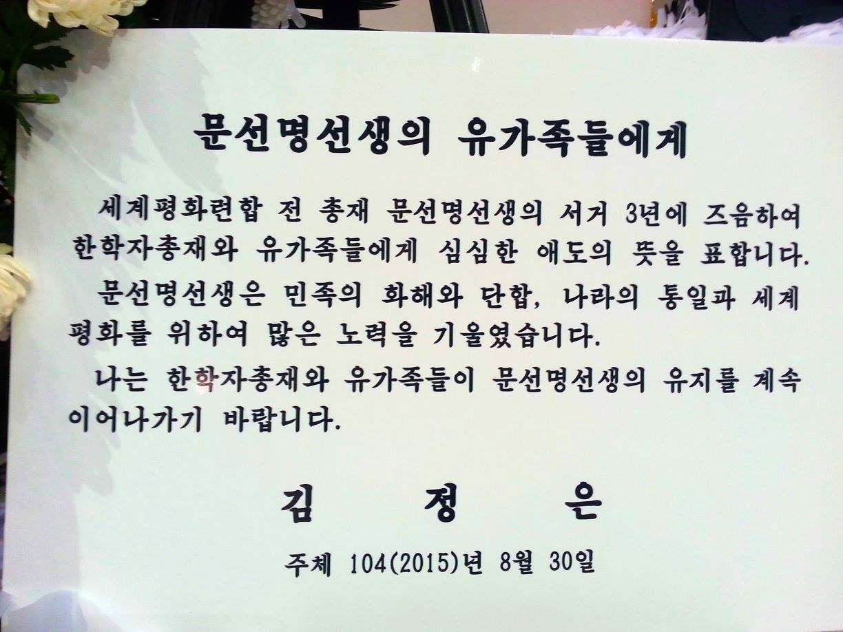 “On the occasion of the third anniversary of death of Mr. Sun Myung Moon, former president of the World Peace Federation, I express profound sorrow to president Hak Ja Han and bereaved family members.