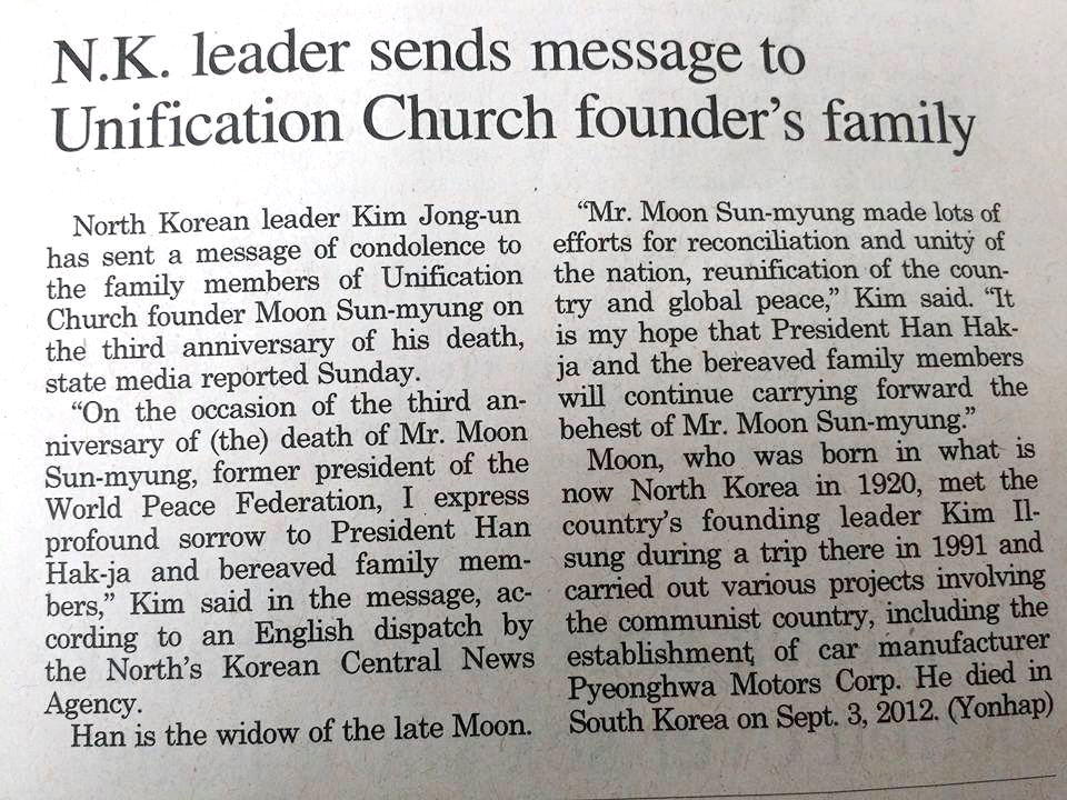 Supreme leader Kim Jong Un sent a message of condolence to the bereaved family members of Moon Sun Myung, former president of the World Peace Federation.