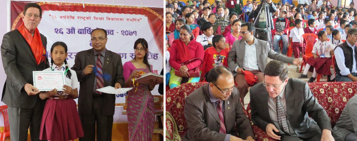 Schools who participated in the Family Festival at the National Stadium on Feb. 21 where 70,000 people attended are welcoming us back in their school. This is based on the respect for our True Parents and good foundation of UPF and FFWPU in Nepal. In fact, schools are actually demanding we come back and continue with True Parents’ education. Dr. Kittle was invited as a “Special Guest” and in this capacity he handed out the awards to the students and also spoke to the parents and students to thank them for supporting the Family Festival.