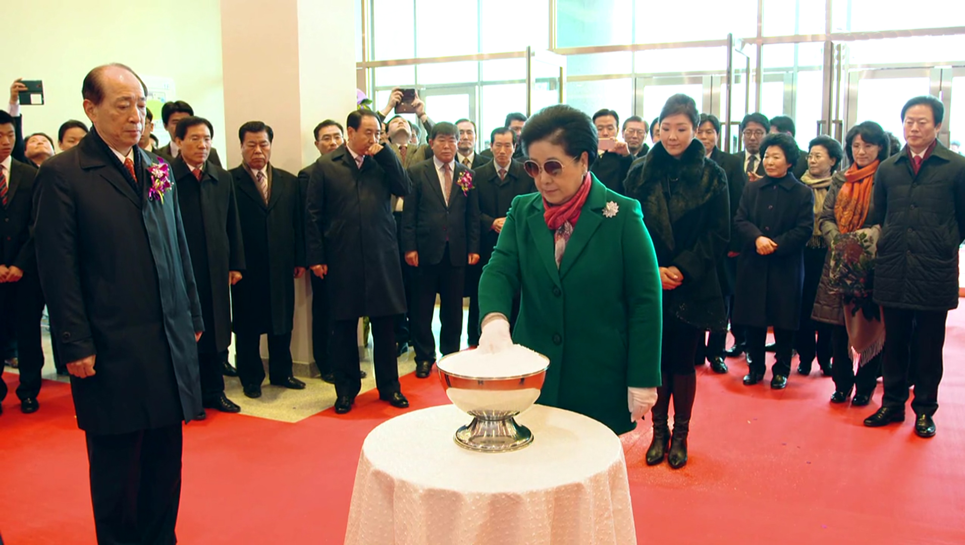 After organizational heads cut the tape, True Mother sprinkled the holy salt so that only Heavenly Parent will claim ownership of the place and so that many blessed families can receive Heaven’s grave in the new building.