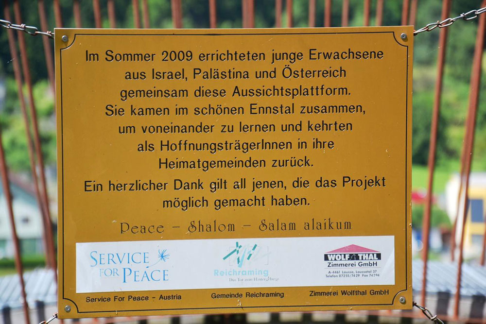 The Peace Bridge was built in 2009 by a group of young people from Israel, Palastine and Austria. In spite of the difficult relationships in the Middle East, the group managed to complete the project together and build friendships with one another.