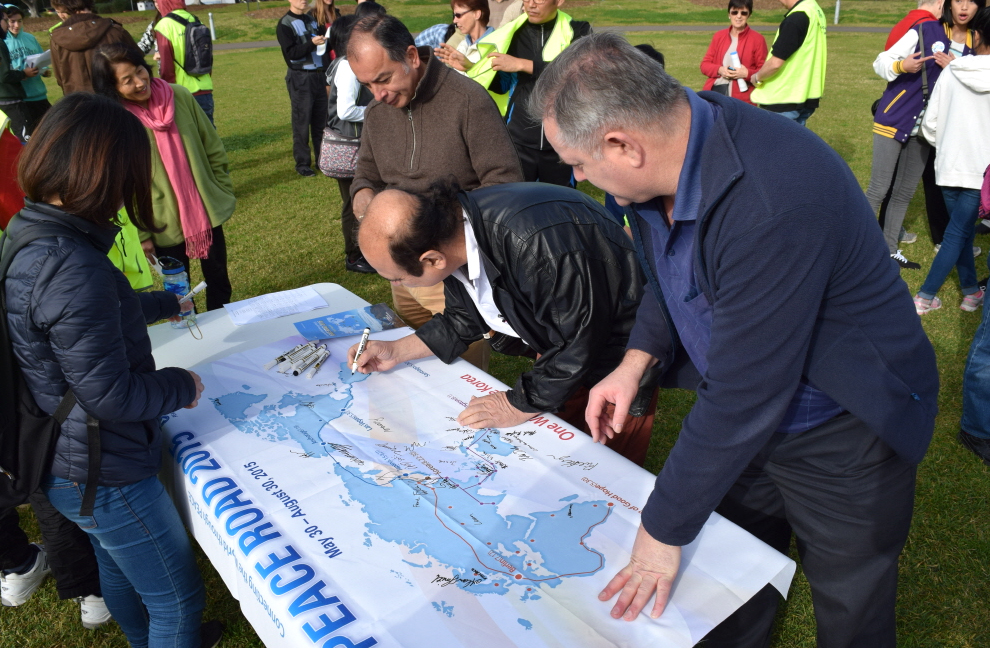 Registration for the participants of the Peace Road project began at 9am, and at this time they were also able to sign the banner with the world map of the peace road. Then at 9:30am the event kicked off with an opening ceremony in a central area of the park led by Jana. There was a launching ceremony with the receiving of Peace Road flag. Rev Lim offered some words on the meaning of the Peace Road and Rev. Moon’s vision, and William explained the logistics of the walk and bike ride. There was a group photo and then everyone who did not bring their own bike went to the bike hire location nearby.