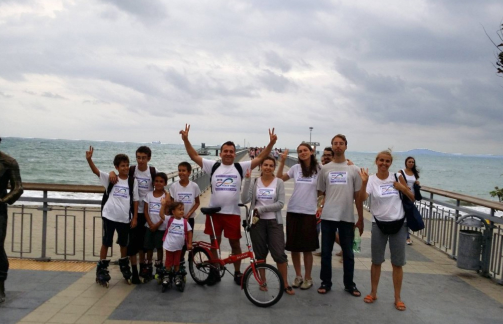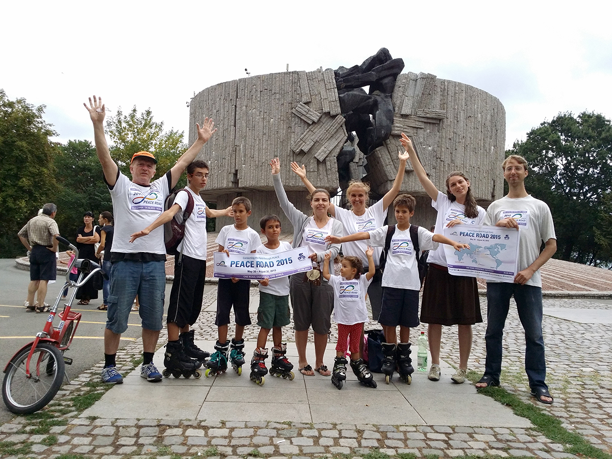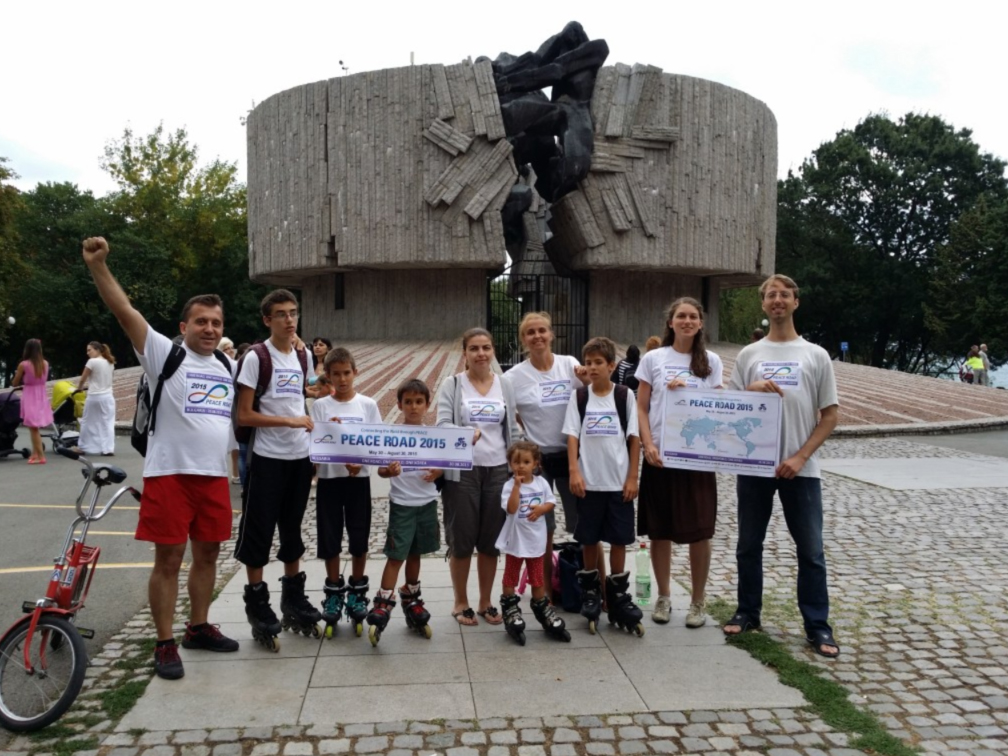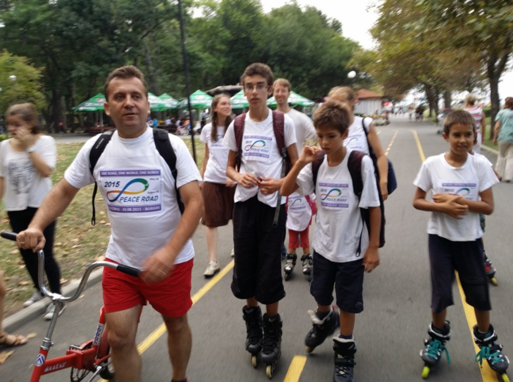 FFWPU Bulgaria: We organized The Peace Road in Burgas – a small town on the Black Sea – on 20.08.2015. We gathered around 6:30 p.m. in front of the place of one Blessed family, dressed in white T-shirts and put some stickers with the logo of Peace Road on them. Our idea was to rent some bicycles since only one of us had one, but unfortunately all stations for renting were out of bicycles. So we decided to walk while children were roller-skating. We walked through the beautiful Sea Garden close to the beach and stopped at few places connected with culture or history of Bulgaria. We were especially happy that the first missionary of Bulgaria was visiting Bulgaria exactly this time together with his daughter and her spouse and they also joined us on the tour.