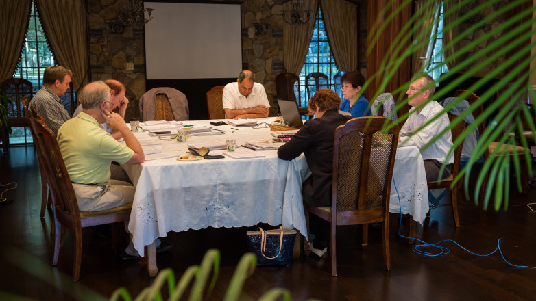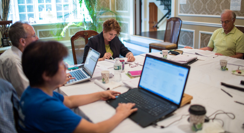 By FFWPU USA: ranslators are doing a final read-through of the English version of the Cham Bumo Gyeong, the third volume of Holy Scriptures after the Cheon Seong Gyeong and Pyeong Hwa Gyeong. It will be printed and presented to True Mother at the third anniversary of True Father’s Seonghwa. The team was assembled earlier this year in March, and have since been working tirelessly to complete the translation. On July 20, 2015, a group of eight people gathered at East Garden to begin the next and final phase: reading the Cham Bumo Gyeong out loud, Hoon Dok Hwe style, to make any final style changes.