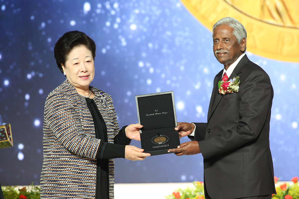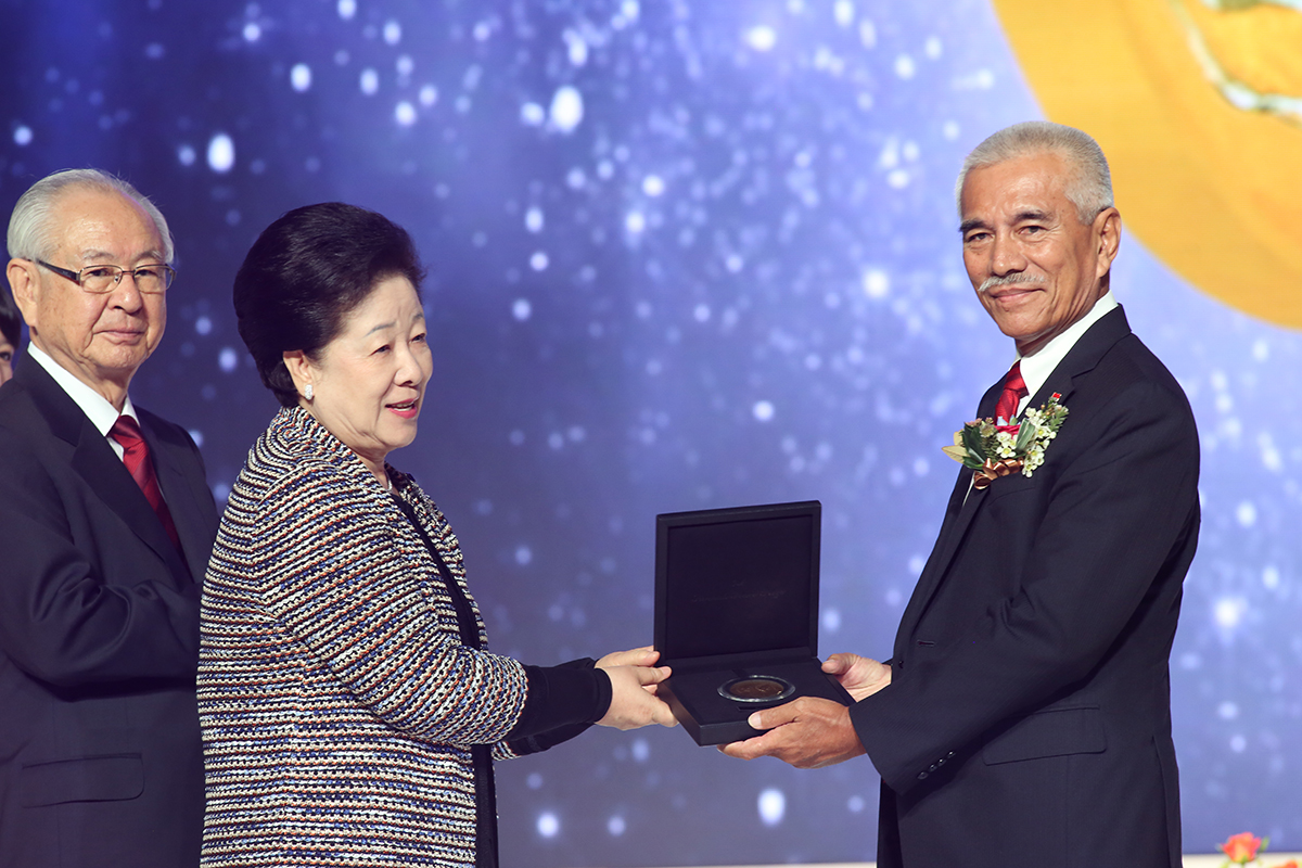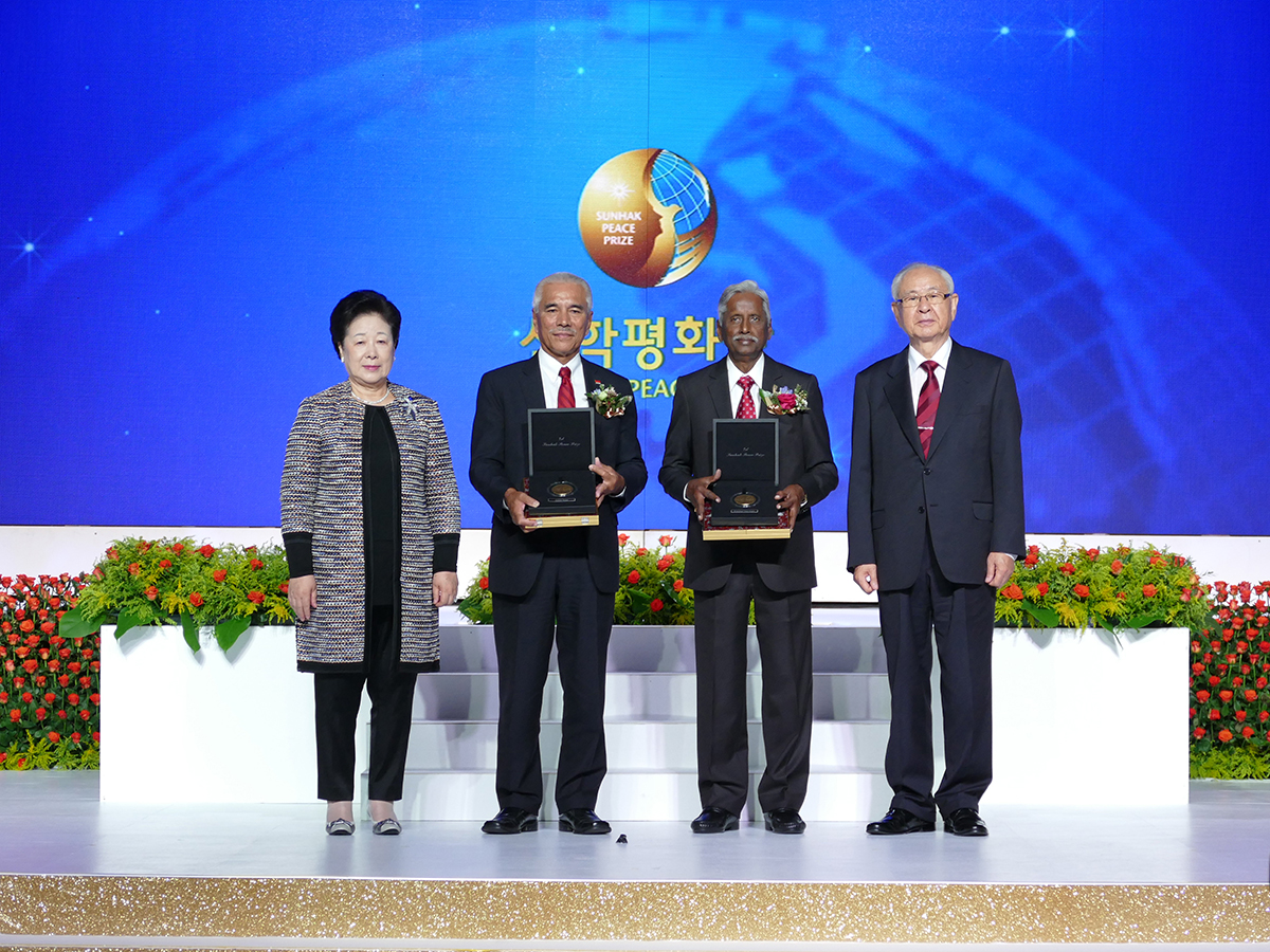 The inaugural Sunhak Peace Prize went to two laureates, His Excellency Anote Tong (age 63), President of Kiribati, and Dr. Modadugu Vijay Gupta (age 76), an Indian fisheries scientist. Each were awarded with a medal from True Mother, the Sunhak Peace Prize founder, and a plaque from Committee Chairman Il Sik Hong.