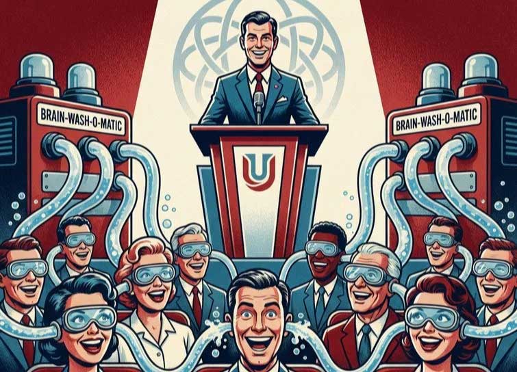 The myth of “brainwashing.” AI elaboration from cartoons of the 1970s.