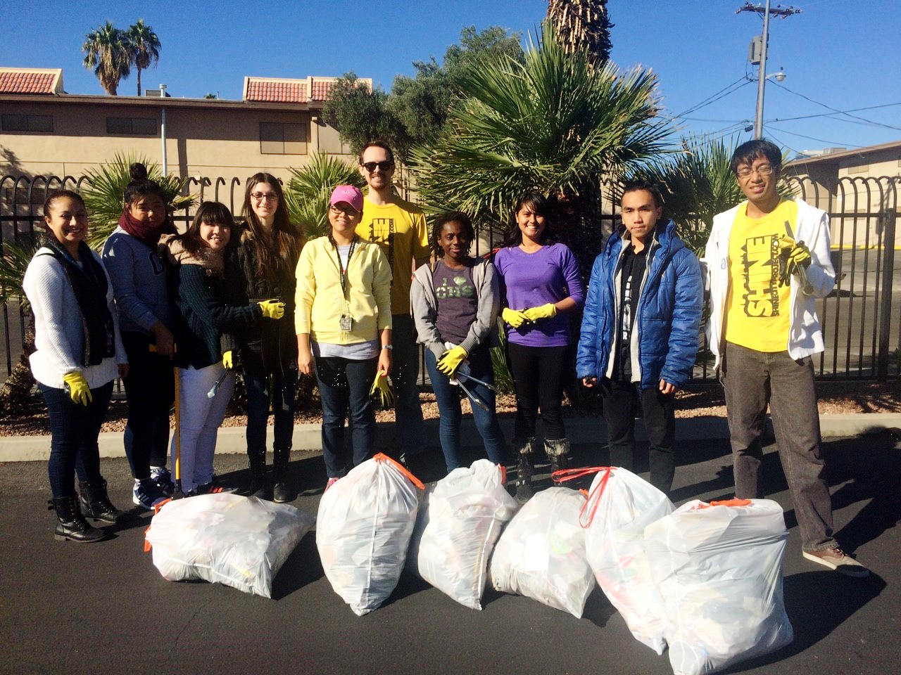 By FFWPU USA: On Friday, November 13, Shine City Project cleaned up near the intersection of Maryland Parkway and Sierra Vista Drive. Eleven volunteers made up of UNLV students and local Japanese missionaries helped to fill six bags of trash. During the service project, a number of onlookers in the area stopped to appreciate the work of the volunteers, including employees of a nearby tire retailer store and orange vendors who gifted a bag of oranges for the volunteers. Janette, a regular member of Shine City Project, led the service project on Friday morning for the first time. For a year and a half, Jeffrey Silerio, former President and current Vice President of the SCP student organization, had organized all of the service projects. With more students being trained to look for and plan service projects, the student organization hopes to grow and have a greater influence in the city.